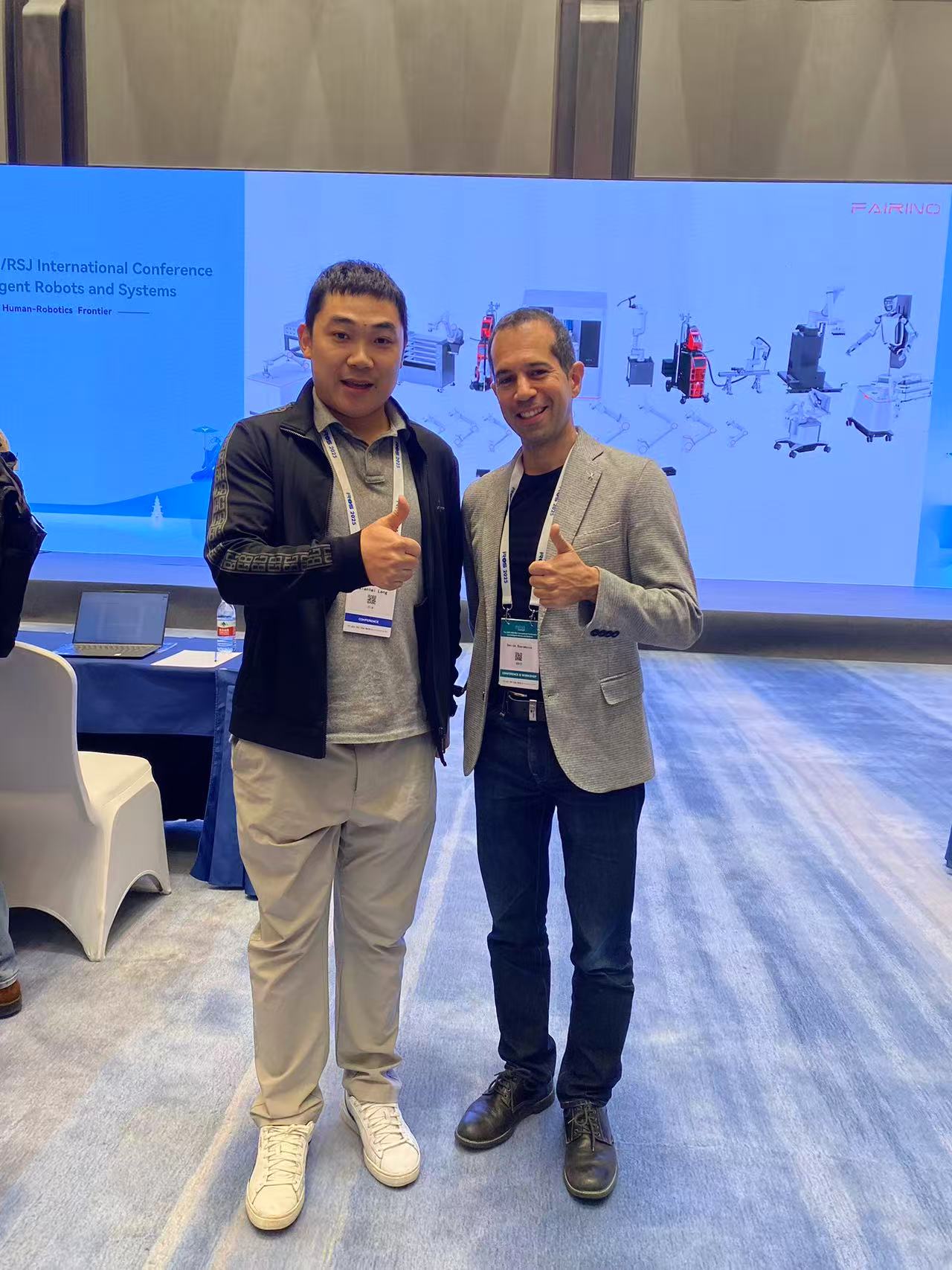 IROS 2025,杭州,大会KeyNoet前,暨日本横滨交流之后,再次与苏黎世大学教授,机器人、无人机领域顶级学者Davide现场交流合影